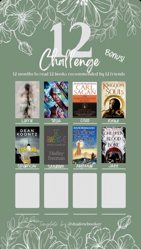 Hello blog friends! Today I wanted to talk a little about this “12 Books for 2022” challenge I took on back in December. The template by @shadowbooker on Instagram was going around on Twitter and while I usually fail horribly at challenges and readathons, finding them more pressure than fun, I figured heck it. It might be interesting to see what people recommend and you know what, it was!