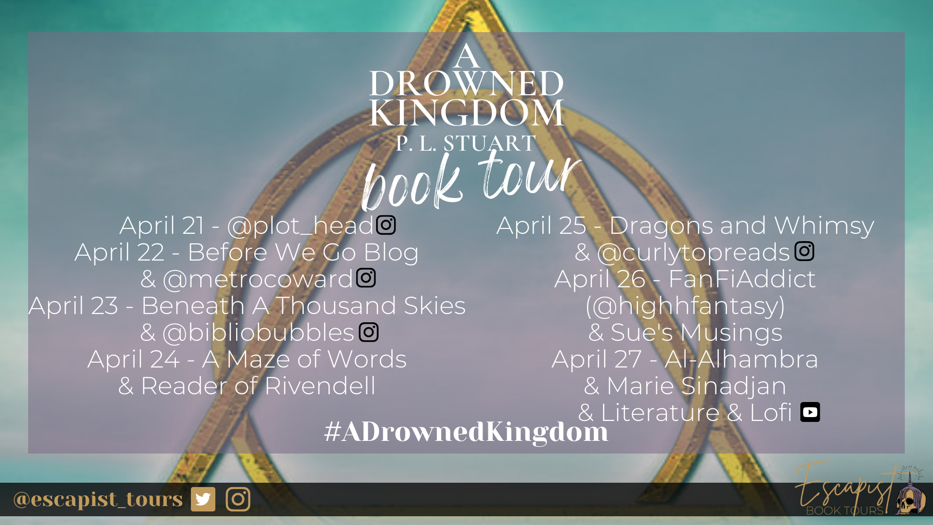 Hello, hello! Today is my stop on the Escapist Tours book tour for A Drowned Kingdom by P.L. Stuart. This is the first in a new epic fantasy series about an exiled people whose ancestral home is buried beneath the waves, and now long to rule once more. It is based on Plato’s lost city of Atlantis, which is a story that has always fascinated me! Sounds awesome, right?!